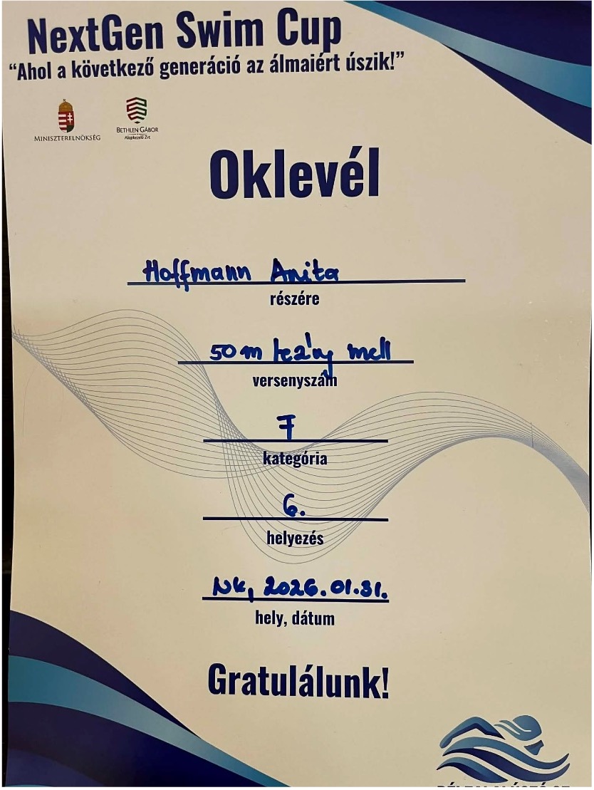 Iskolánk 3. osztályos tanulója, Hoffmann Anita vett részt ezen a megmérettetésen. Anita amatőr úszó, ezen a versenyen igazolt sportolókkal kellett a rajtkőre állnia. Nagyon ügyesen szerepelt. Gyors versenyszámban 8., mellúszásban pedig 6. helyezett lett. A sok edzés meghozta eredményét.