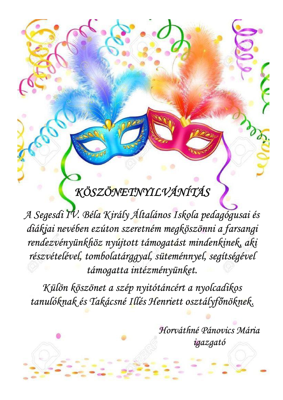 A Segesdi IV. Béla Király Általános Iskola pedagógusai és diákjai nevében ezúton szeretném megköszönni a farsangi rendezvényünkhöz nyújtott támogatást mindenkinek, aki részvételével, tombolatárggyal, süteménnyel, segítségévek támogatta intézményünket.